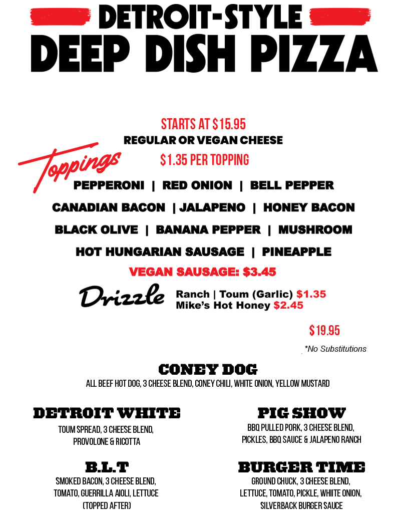 The best Detroit-style pizza in Las Vegas. Guerrilla Pizza delivers the square, deep-dish style known for its crispy edges, airy center, and bold flavor. Our pies are built with quality ingredients and topped edge-to-edge for a hearty, satisfying bite.